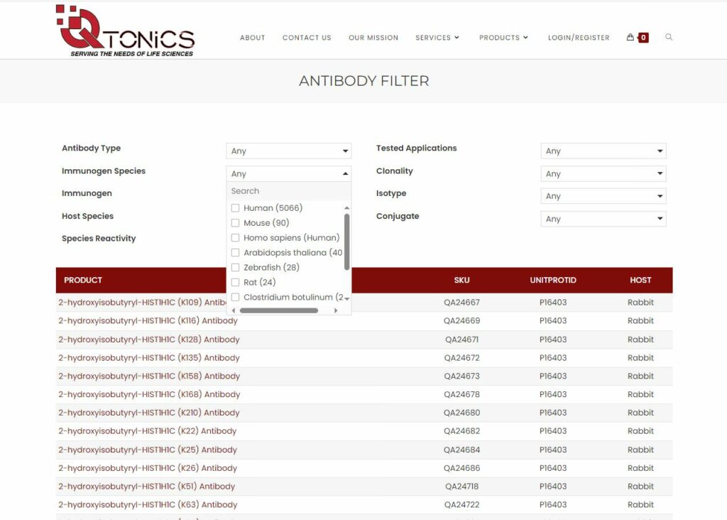 In response to the vast selection of Antibody products on Qtonics, we designed and implemented a specialized search filter page. This feature empowers customers to effortlessly navigate through the extensive inventory of over 60,000 Antibody products, improving their overall shopping experience.